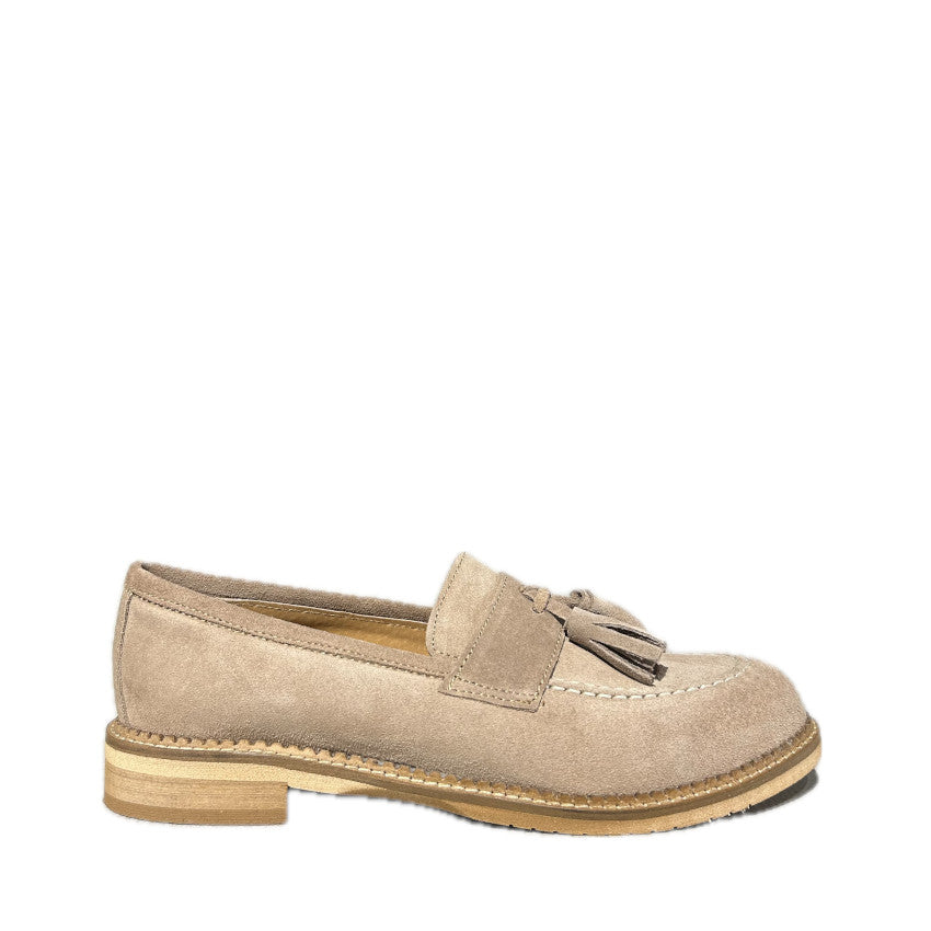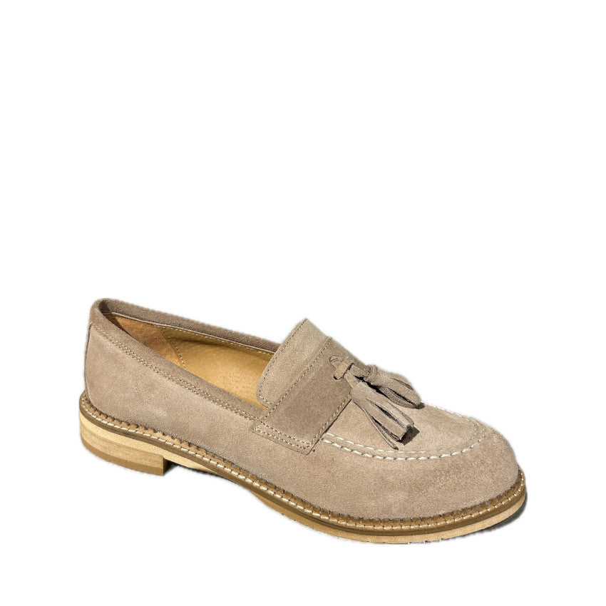 Tonalità neutra, stile intramontabile: questo mocassino in morbido camoscio color visone è un perfetto equilibrio tra raffinatezza e praticità. Le nappine decorative sulla parte frontale aggiungono un tocco classico a un modello pensato per chi ama la sobrietà con carattere.