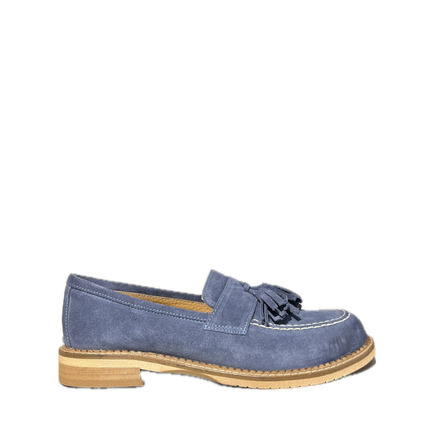 Fresco, sofisticato e perfetto: questo mocassino in morbido camoscio color jeans è arricchito da eleganti nappine tono su tono, che aggiungono un tocco raffinato a un modello dal gusto classico rivisitato in chiave moderna.