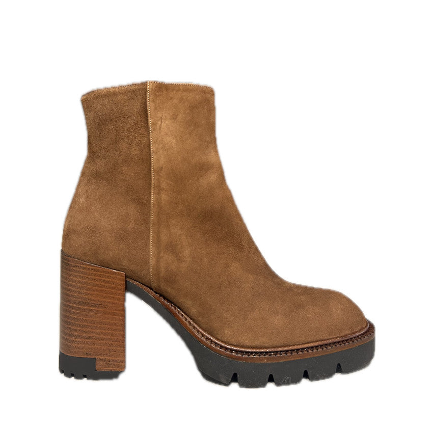 Tronchetto con tacco in camoscio cuoio, con zip laterale. Suola in gomma.
