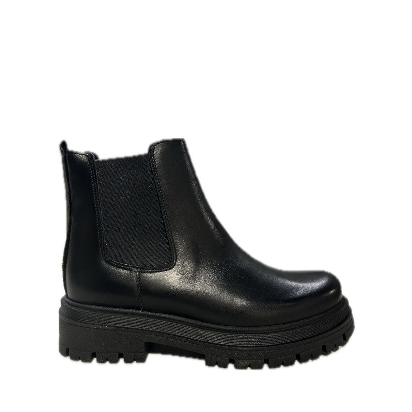 Versatile e contemporaneo, questo stivaletto Chelsea da donna in pelle nera è un must-have di stagione. Il design con inserti elastici laterali assicura una calzata comoda e veloce, mentre la suola carrarmato dona un tocco grintoso e moderno, garantendo al tempo stesso stabilità e comfort.