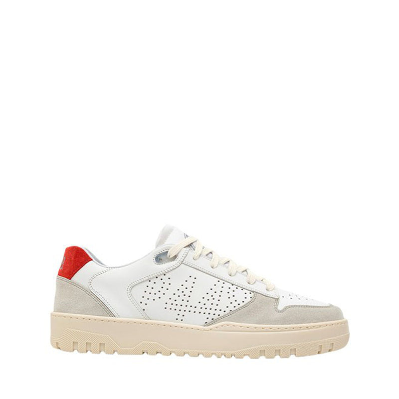 La Sneakers di P448 modello Mason è ispirata al basket con tomaia in pelle bianca, linguetta in nylon bianco, finiture in pelle scamosciata beige, lacci color crema e linguetta sul tallone in pelle scamosciata rossa.