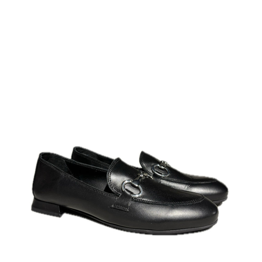 Un grande classico rivisitato in chiave moderna: questo mocassino in vera pelle nera con morsetto metallico è la scelta perfetta per chi cerca raffinatezza e comfort in un’unica scarpa. Il design essenziale, arricchito dal dettaglio frontale cromato, lo rende ideale sia per un look da ufficio che per outfit più casual-chic.